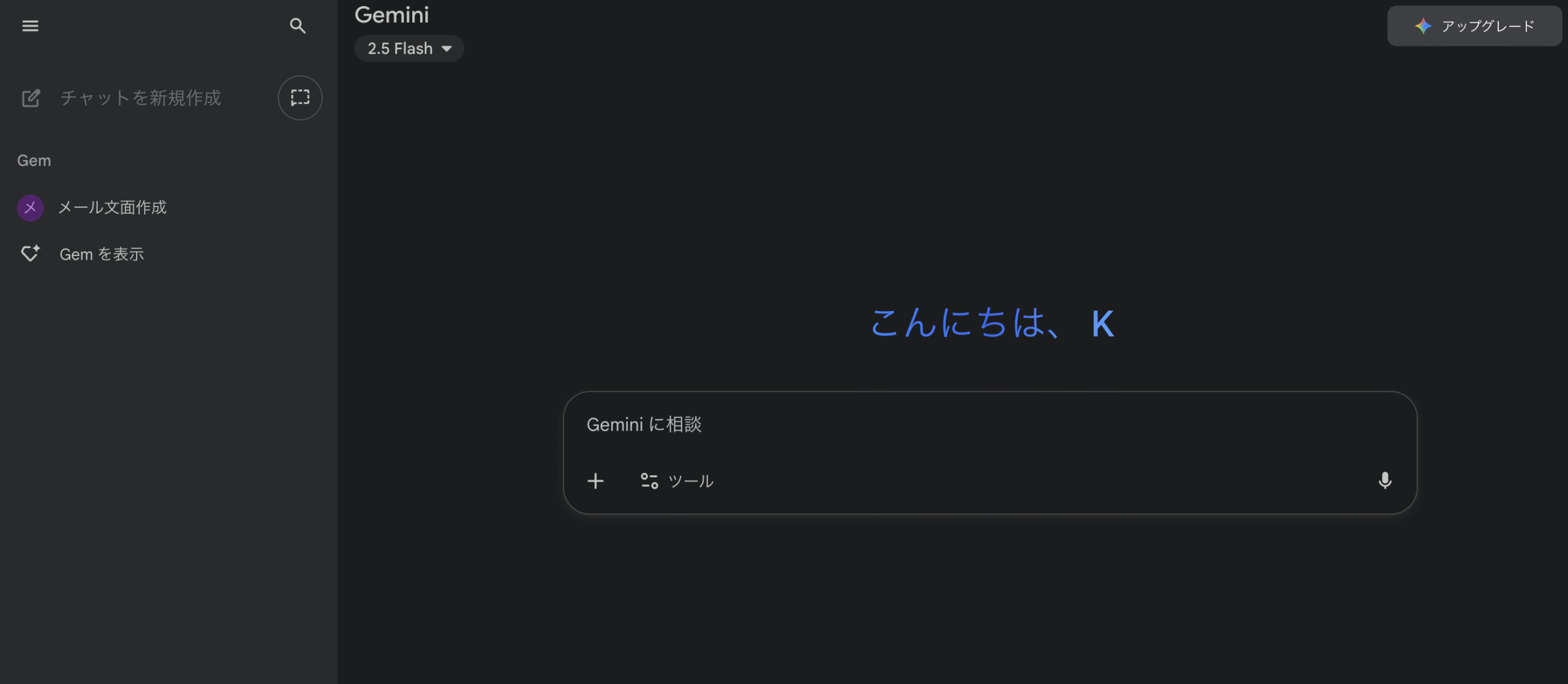 Geminiのチャット画面を開き、のアイコン(ファイルをアップロード)をクリックします。