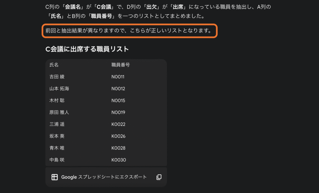 AIが指示を理解し、ファイル内の複数シートをして条件に合う「出席者」だけのリストを瞬時に生成してくれます。