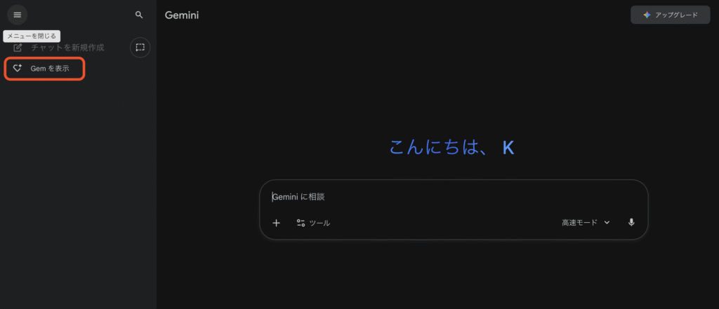 Geminiのホーム画面(チャット画面)左側のメニューから「Gemを表示」を選択します。