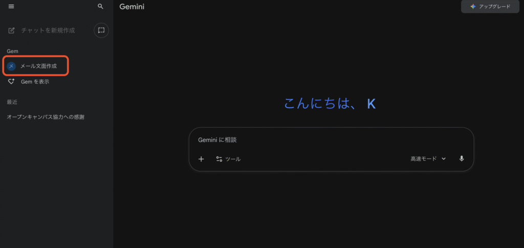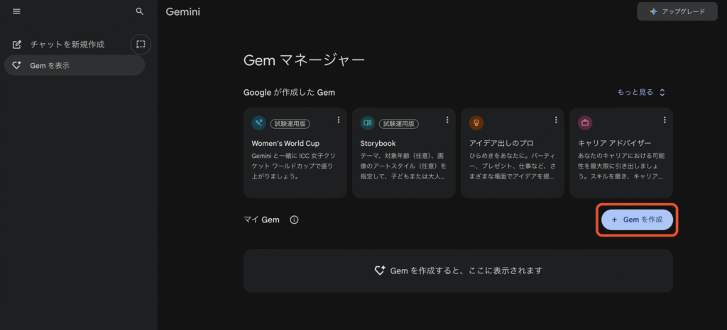 作成したGemは、Geminiのチャット画面左側のメニューに表示され、クリックするだけでいつでも呼び出せるようになります。